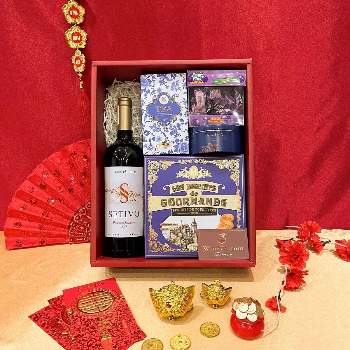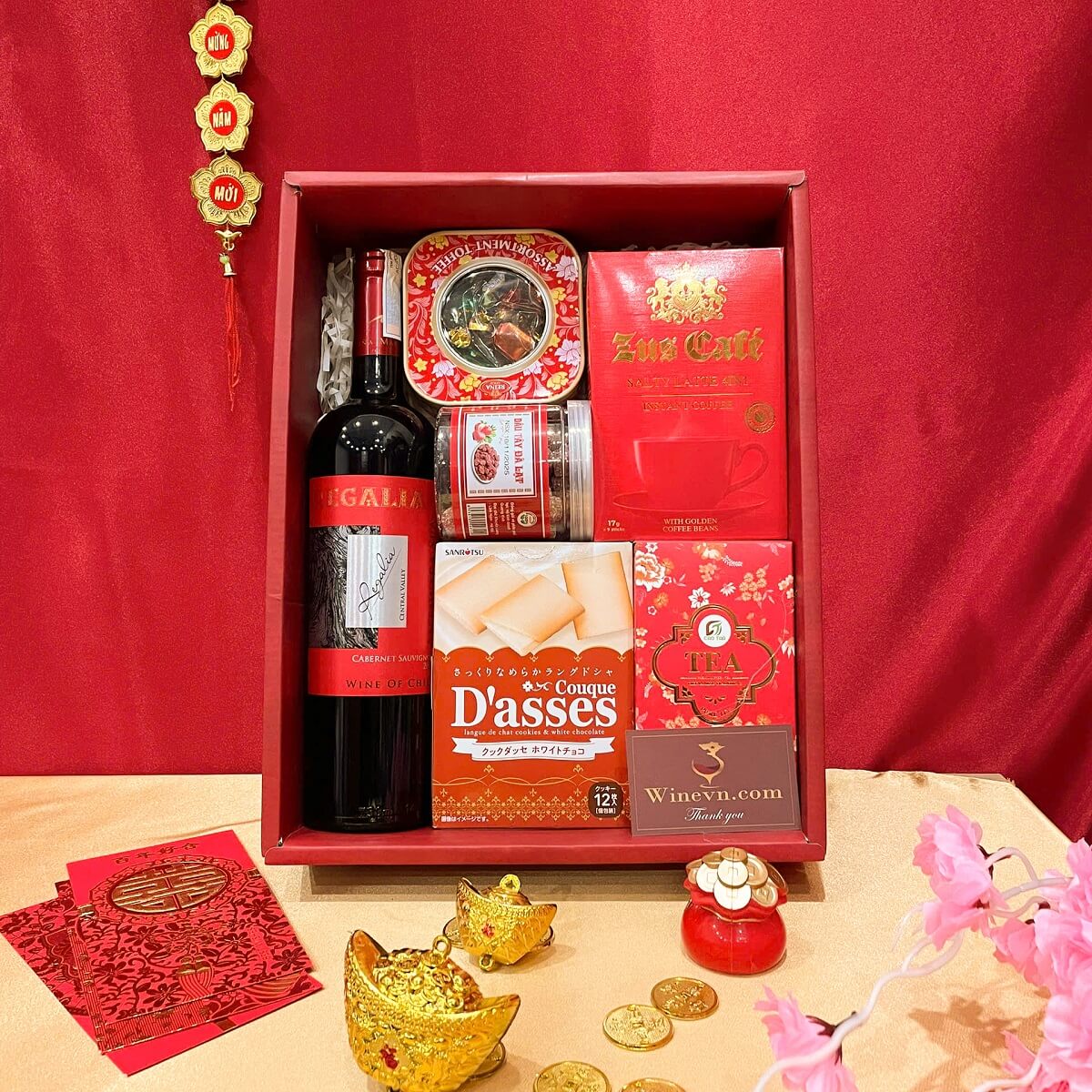 Bên trong hộp quà đặc biệt này bao gồm các loại bánh kẹo chất lượng cùng một chai vang đỏ Regalia đậm đà hương vị. Tất cả mang đến sự kết hợp hoàn hảo để làm phong phú thêm không khí ngày Tết.