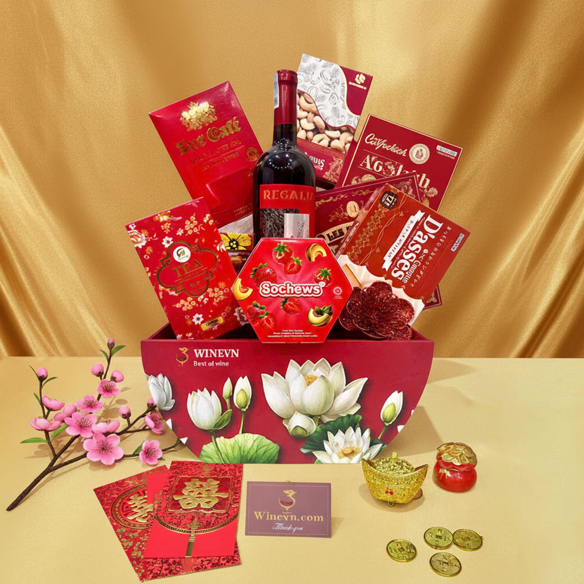 Giỏ quà Tết GQT2601 mang sắc đỏ rực rỡ cùng thiết kế hoa sen trang nhã, đại diện cho sự thịnh vượng và an yên đầu năm. Bộ quà được phối hợp từ rượu vang và các sản phẩm cao cấp, phù hợp biếu tặng doanh nghiệp, đối tác và người thân trong dịp Tết.