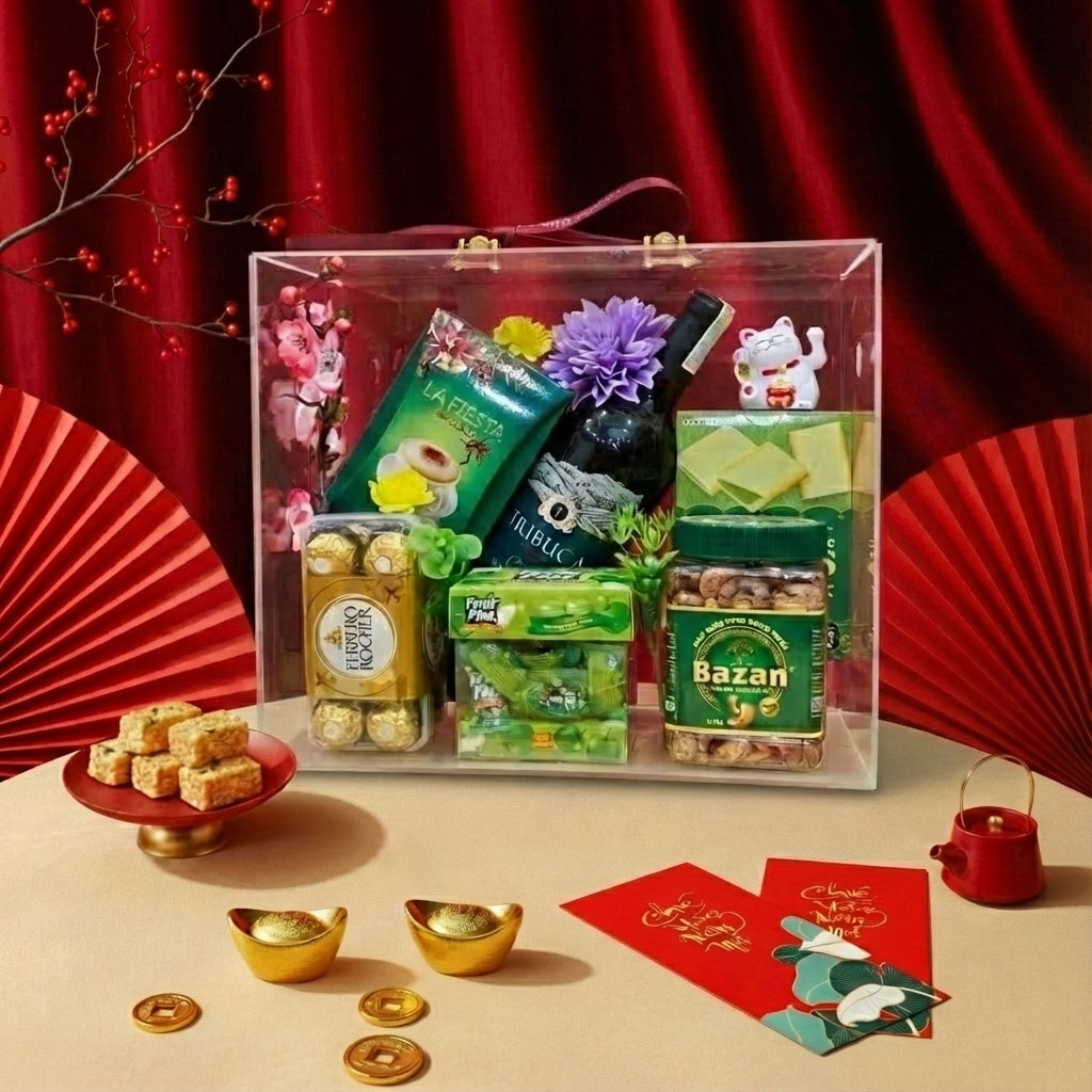 Giỏ Quà Tết Lộc Xuân GQT2615 thuộc nhóm quà Tết màu xanh, đại diện cho sự sinh sôi, an hòa và nguồn năng lượng tích cực đầu năm. Gam xanh mang thông điệp về khởi đầu suôn sẻ, bền vững và hanh thông trong công việc lẫn cuộc sống. Sự kết hợp hài hòa giữa rượu vang, cà phê, bánh kẹo và hạt dinh dưỡng giúp set quà truyền tải lời chúc năm mới nhẹ nhàng nhưng trọn vẹn, phù hợp với nhiều đối tượng người nhận trong dịp Tết.