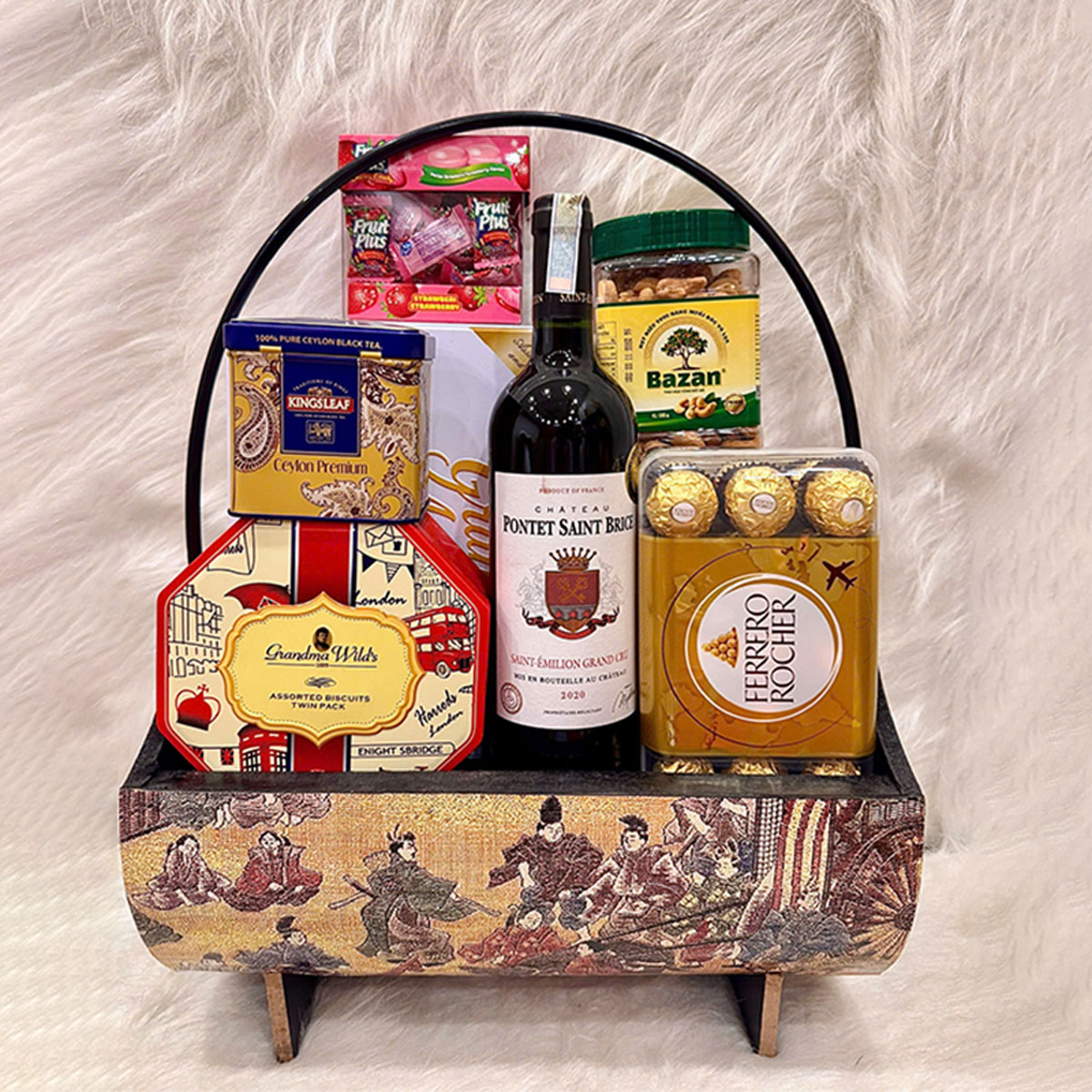 Giỏ quà Tết GQT2604 sở hữu thiết kế độc đáo với tông màu truyền thống và họa tiết văn hóa Việt Nam, mang lại cảm giác trang trọng và ý nghĩa khi biếu tặng. Set quà được kết hợp từ rượu vang Grand Cru, bánh quy, chocolate, trà và hạt dinh dưỡng cao cấp, phù hợp làm quà tặng doanh nghiệp và gia đình.