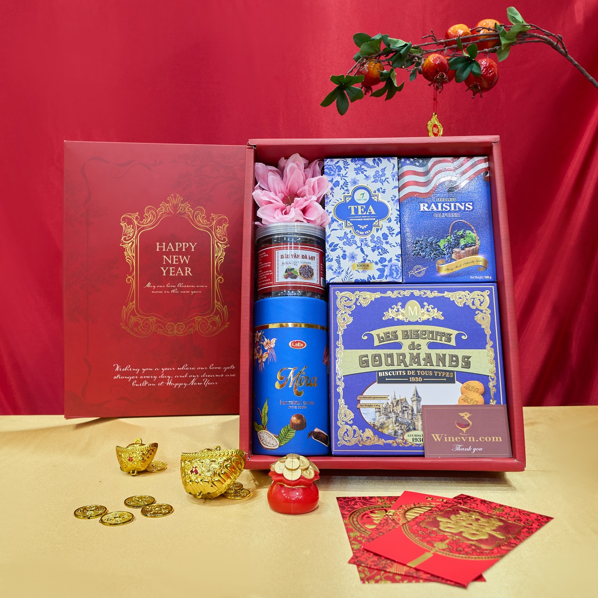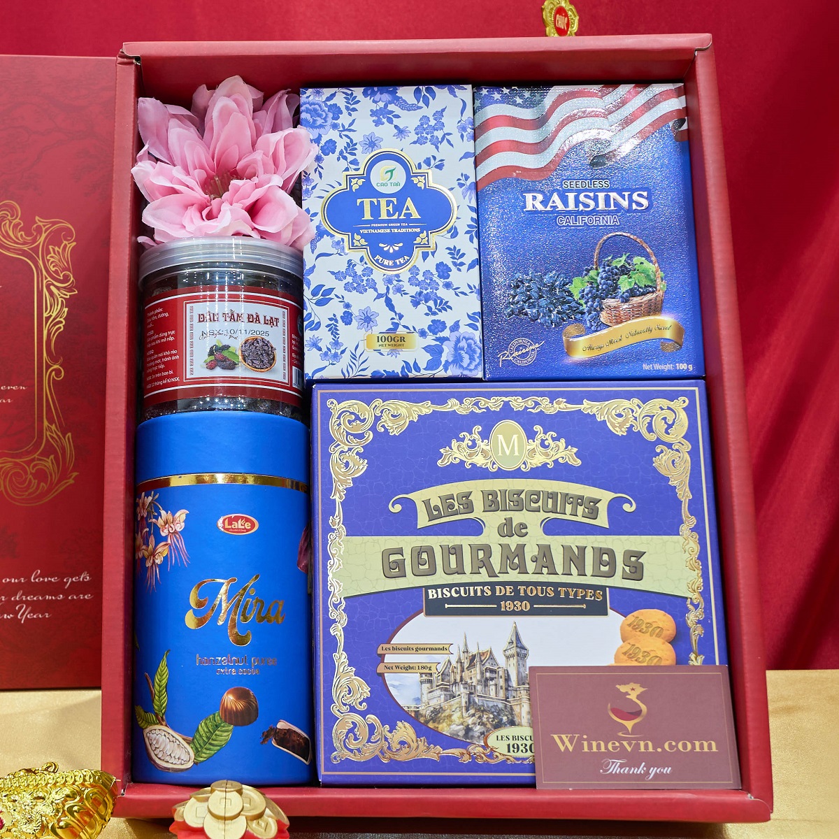 Bên trong hộp là bộ sưu tập các sản phẩm được chọn lọc tỉ mỉ: Trà cao cấp, bánh quy nhập khẩu, nho khô tuyển chọn, hạt dinh dưỡng, socola nhập khẩu. Tất cả được sắp xếp chỉnh chu, mang đến trải nghiệm mở hộp chỉn chu và ấm áp.