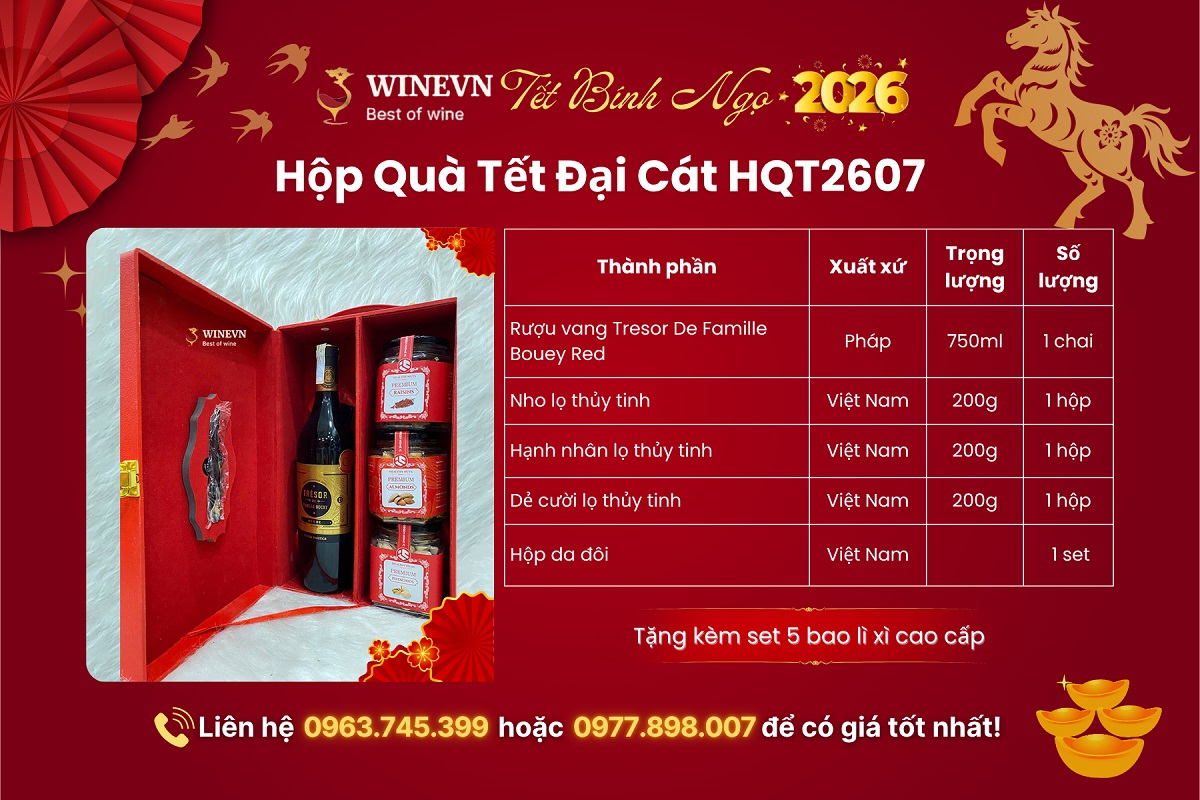 WineVN cung cấp Hộp Quà Tết Đại Cát HQT2607 với mức giá hấp dẫn, sản phẩm nhập khẩu chính hãng và quy trình đóng gói cẩn thận trong từng chi tiết. Khi đặt mua, bạn sẽ được tặng kèm set 5 bao lì xì cao cấp và hỗ trợ tư vấn lựa chọn mẫu quà phù hợp với ngân sách và mục đích biếu tặng. WineVN nhận giao hàng nhanh toàn quốc, giao hỏa tốc nội thành, bảo đảm hộp quà luôn được bàn giao trong trạng thái hoàn thiện và sang trọng nhất.