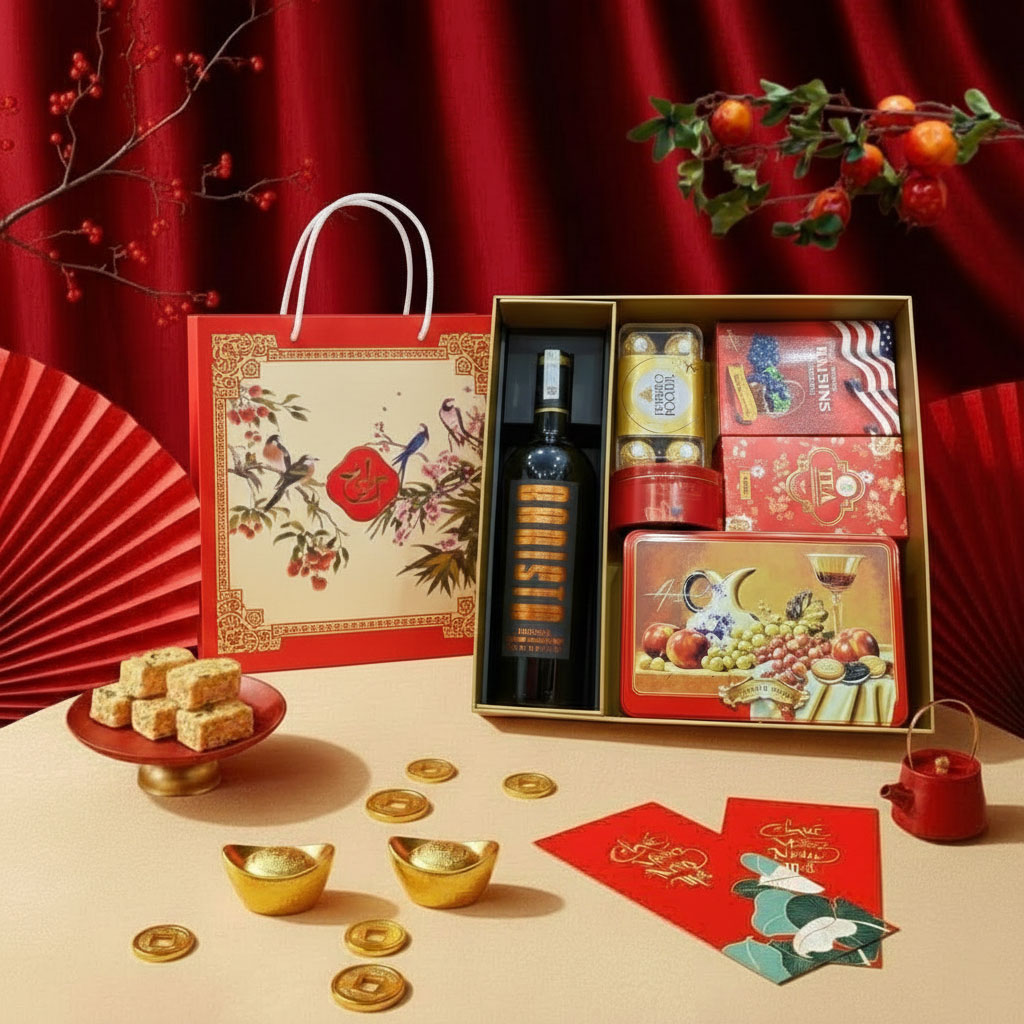 Hộp Quà Tết Đại Cát HQT2646 thuộc nhóm hộp quà Tết màu đỏ, mang sắc thái trang trọng và nổi bật trong biếu tặng đầu năm. Thiết kế hộp cứng cao cấp cùng cách sắp xếp quà cân đối tạo cảm giác đầy đặn, chỉn chu khi trao tay. Sự kết hợp hài hòa giữa rượu vang, bánh kẹo, trà và Socola mang đến trải nghiệm thực tế, phù hợp nhiều đối tượng nhận quà.