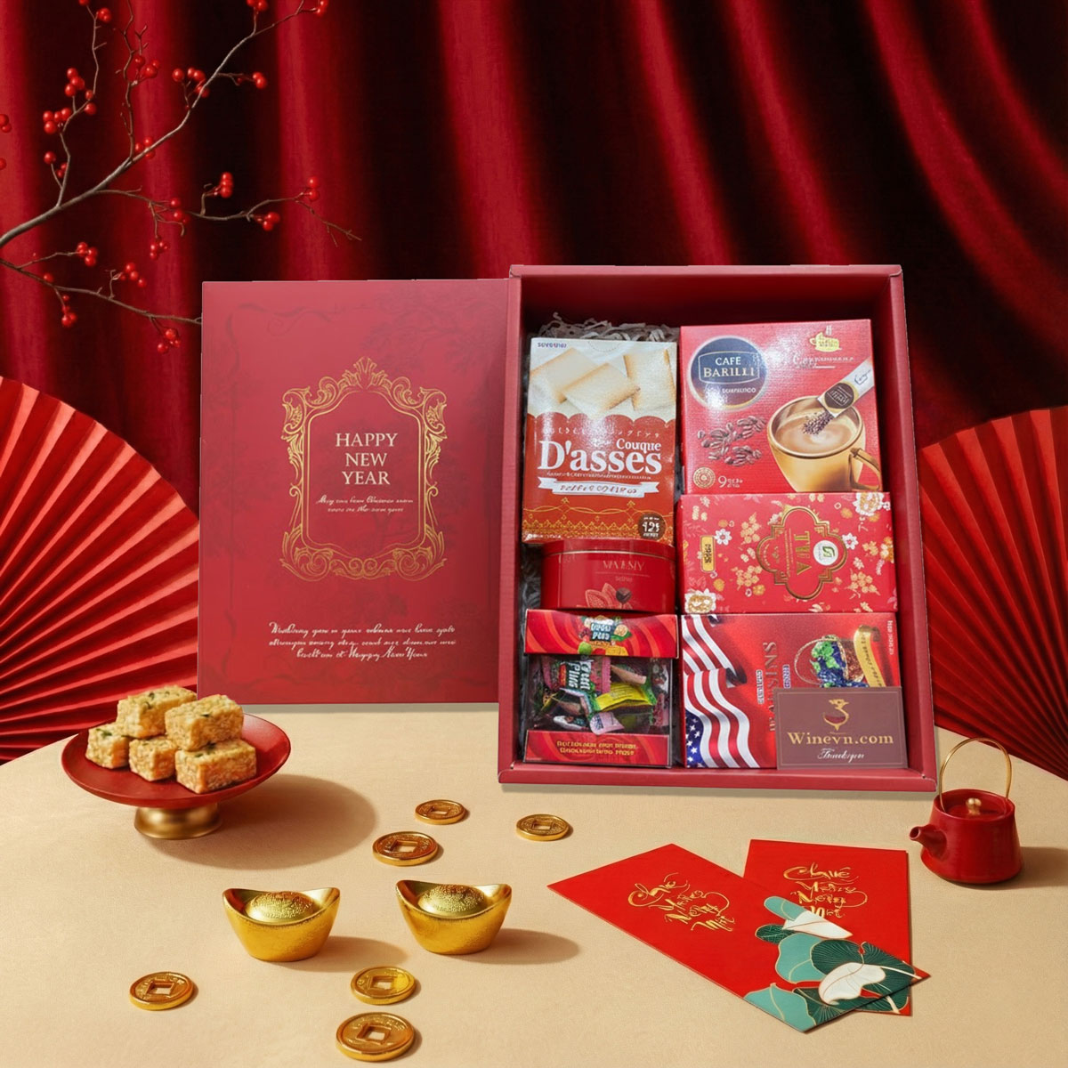 HQT2621 được thiết kế theo concept Tết Phúc Lộc, mang thông điệp may mắn, hỷ sự và sung túc trong năm mới. Hộp quà Tết sắc đỏ vàng trên hộp quà tượng trưng cho tài lộc dồi dào, còn các sản phẩm bên trong được chọn lọc kỹ càng, bao gồm bánh kẹo nhập khẩu, cà phê, chocolate và các món quà truyền thống, giúp người nhận cảm nhận được sự trân trọng và chỉn chu trong từng chi tiết.
