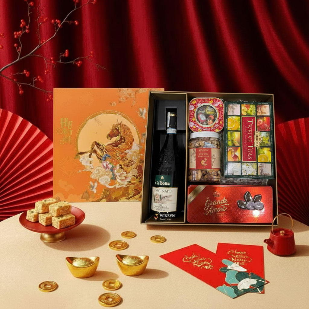 Hộp Quà Tết Sắc Xuân HQT2614 mang tinh thần tươi sáng của Tết Bính Ngọ với thiết kế hộp sang trọng, phối màu đỏ – vàng – xanh tượng trưng cho may mắn và thịnh vượng. Lấy cảm hứng từ hình ảnh ngựa vàng bứt phá, sản phẩm là lựa chọn lý tưởng cho doanh nghiệp và cá nhân tìm kiếm hộp quà Tết chỉn chu, giàu giá trị biếu tặng.