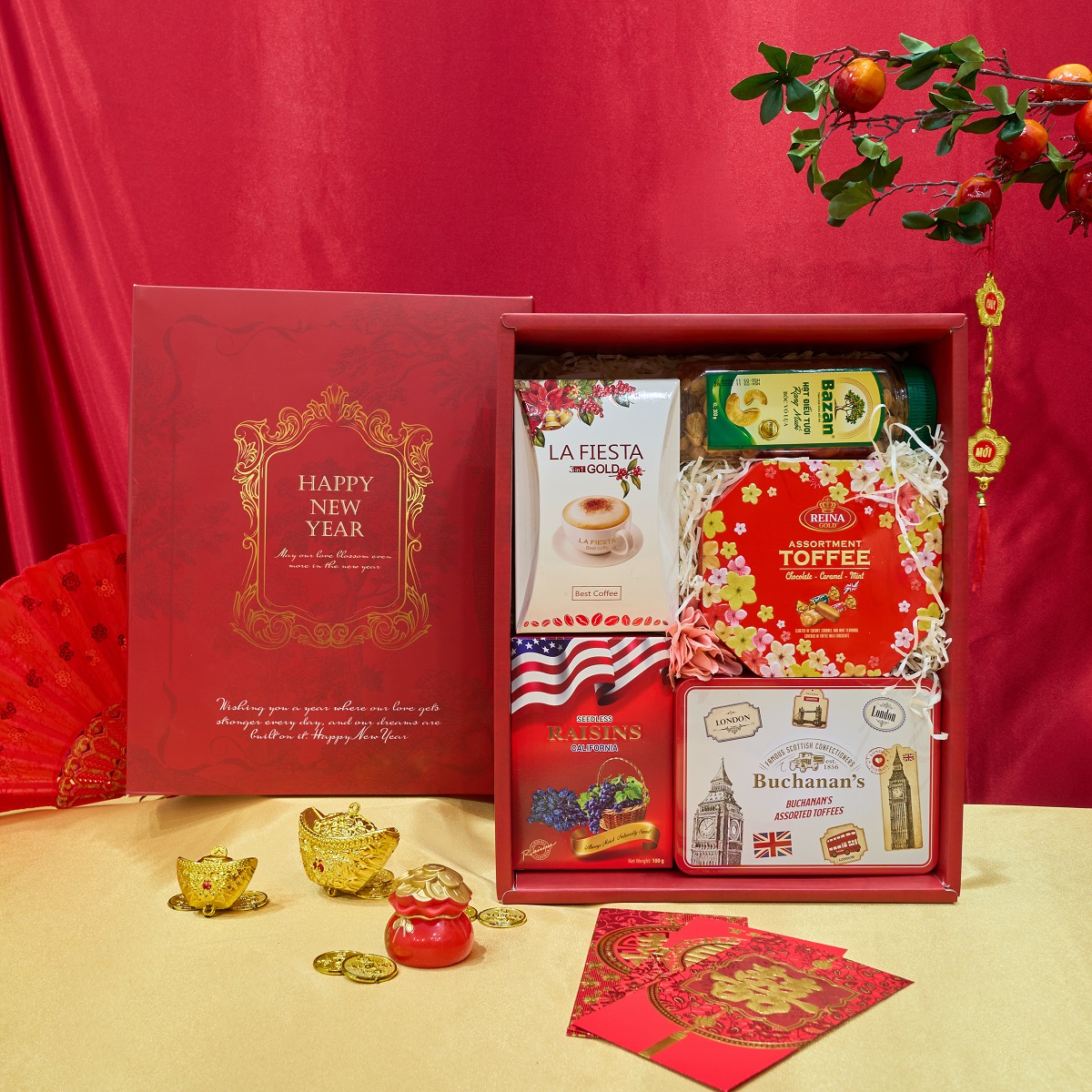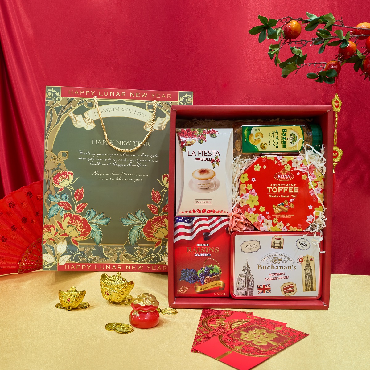 Sắc Xuân HQT2625 mang thiết kế rực rỡ, tươi sáng đúng tinh thần ngày Tết, kết hợp cùng các sản phẩm nhập khẩu chất lượng cao. Hộp quà Tết là món quà thích hợp để biếu tặng người thân, khách hàng, đối tác và đồng nghiệp, thay lời chúc năm mới an vui, may mắn và thịnh vượng.