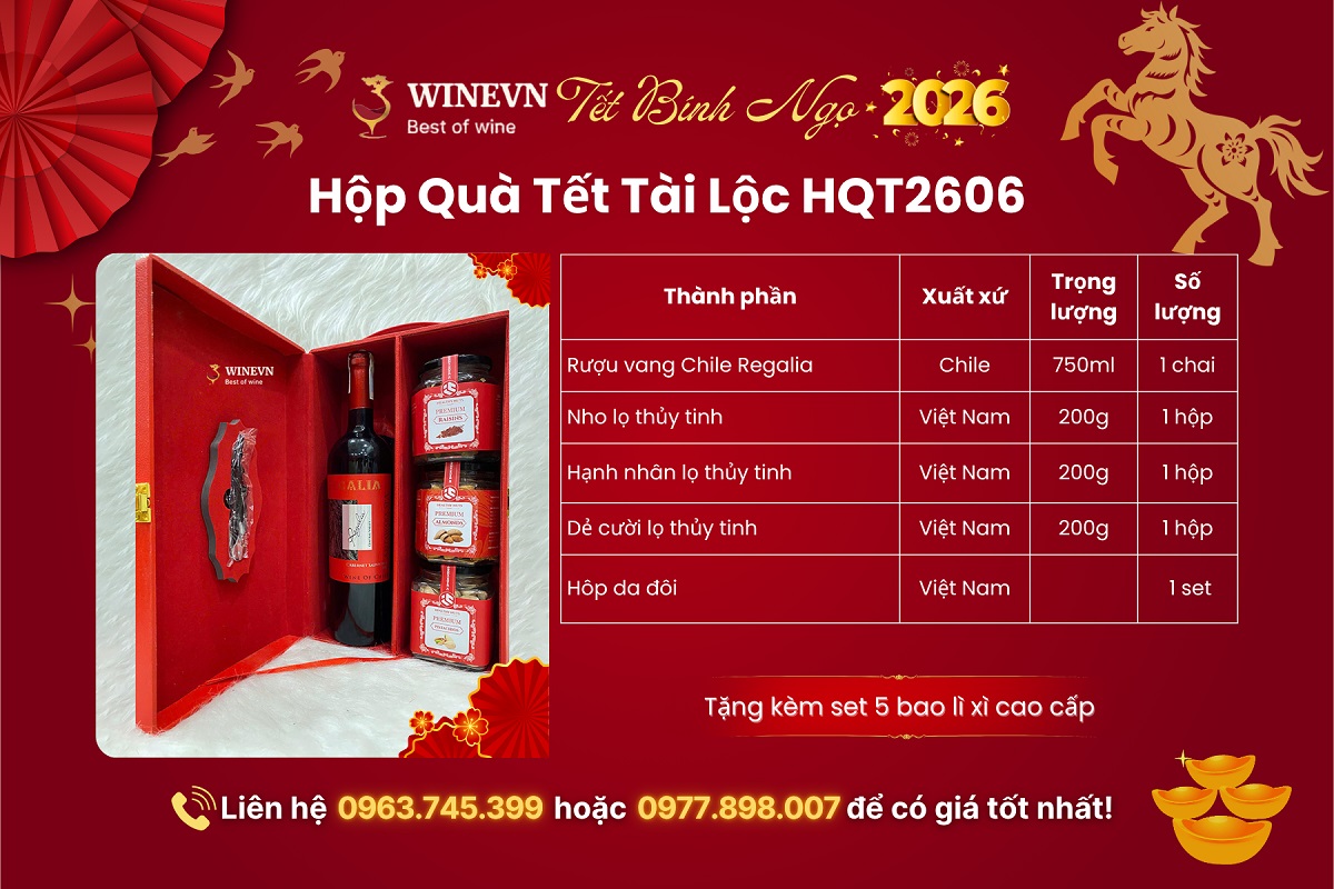 Tài Lộc HQT2606 thể hiện lời chúc thịnh vượng và phát đạt trong năm mới. Rượu vang tượng trưng cho sự gắn kết và một khởi đầu tốt đẹp, còn nho khô, hạnh nhân và dẻ cười lại mang ý nghĩa sung túc, tài lộc và sức khỏe. Sự phối hợp của ba loại hạt trong thiết kế quà Tết màu đỏ rực mang đến thông điệp may mắn và hanh thông, rất phù hợp cho những buổi tri ân và trao gửi tấm lòng đầu xuân.