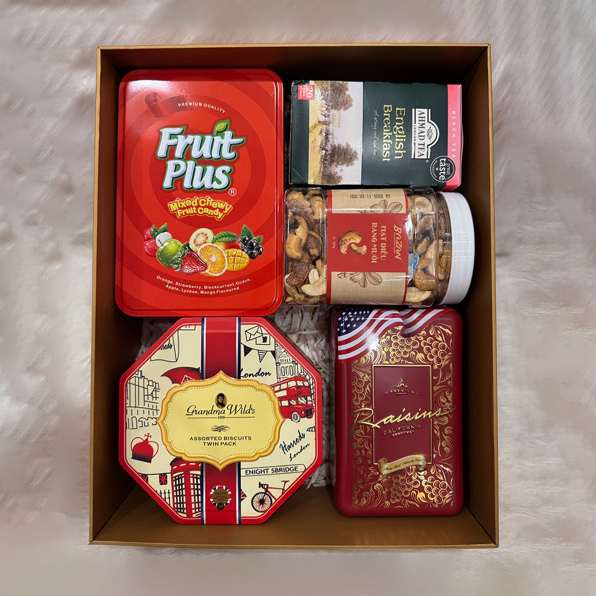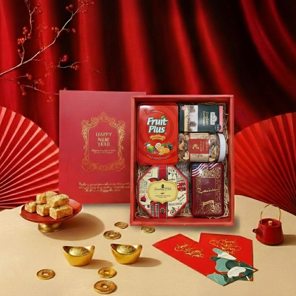 Mang thông điệp Tài lộc sung túc – Phúc an viên mãn, hộp quà Tết màu đỏ HQT2611 kết hợp các sản phẩm ngọt ngào, giòn thơm và giàu dinh dưỡng, tạo nên món quà dung hòa cả giá trị sức khỏe lẫn ý nghĩa tinh thần. Đây là lựa chọn chuẩn mực dành cho doanh nghiệp muốn gửi lời tri ân cuối năm một cách lịch sự, sang trọng và ý nghĩa.