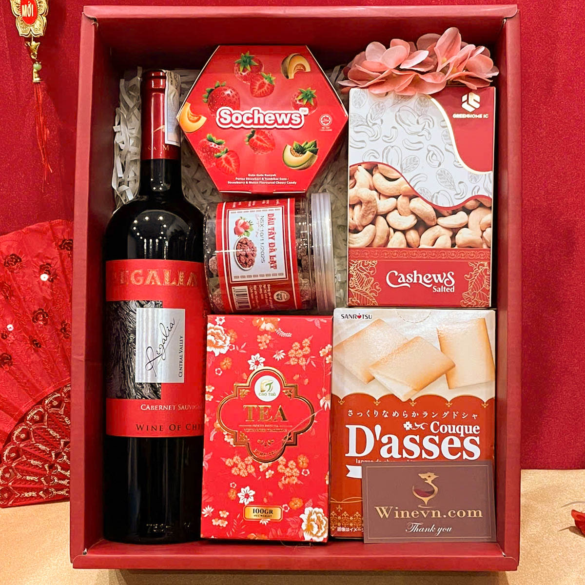Điểm nhấn của set quà là rượu vang Chile Regalia, đại diện cho sự gắn kết bền vững và lời chúc thành công lâu dài. Các sản phẩm đi kèm như bánh trà xanh Nhật Bản, trà Tân Cương, mận gừng cay, kẹo mềm nhập khẩu và hạt điều trong nước được lựa chọn hài hòa giữa hương vị hiện đại và nét truyền thống, phù hợp khẩu vị đa dạng của người Việt trong không khí sum vầy đầu xuân.