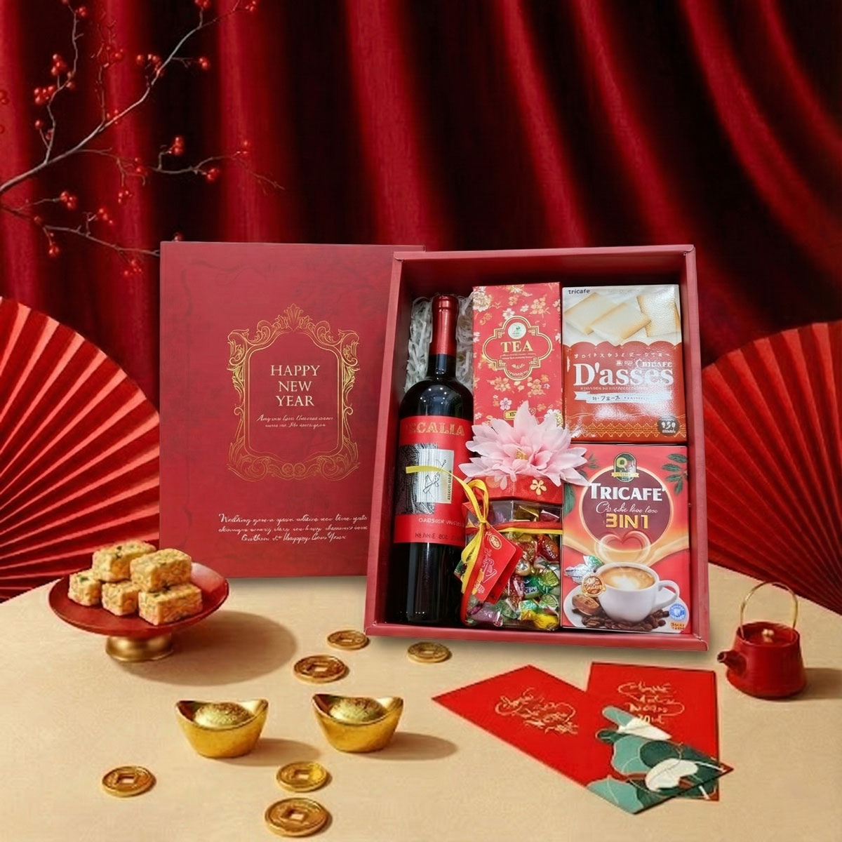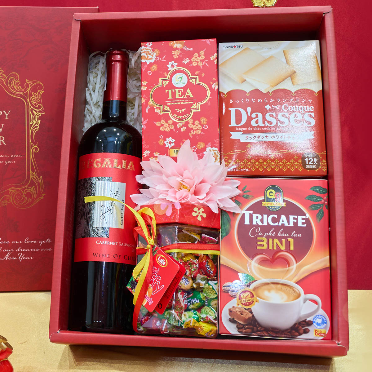 Hộp Quà Tết Tài Lộc HQT2629 là mẫu hộp quà Tết 2026 màu đỏ được thiết kế trang trọng cho dịp Tết Bính Ngọ 2026. Set quà kết hợp hài hòa giữa rượu vang nhập khẩu từ Chile cùng bánh kẹo, trà và cà phê chọn lọc, mang đến món quà chỉn chu, dễ trao tặng cho khách hàng, đối tác và người thân trong những ngày đầu năm.