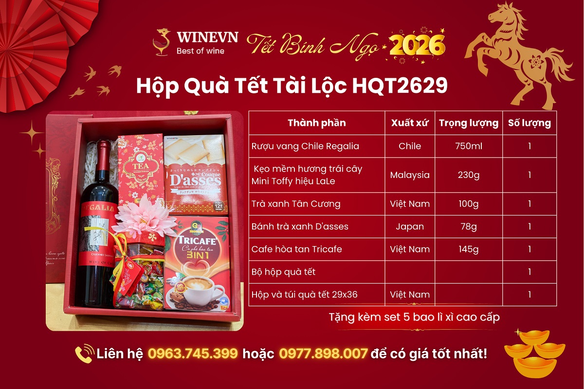 WineVN cung cấp Hộp Quà Tết Tài Lộc HQT2629 với thành phần chọn lọc, nguồn gốc rõ ràng và đóng gói chỉn chu, đáp ứng nhu cầu biếu tặng trong dịp Tết Bính Ngọ 2026. Khách hàng được tư vấn chọn quà theo ngân sách, hỗ trợ thiết kế theo yêu cầu doanh nghiệp và giao hàng linh hoạt trên toàn quốc.