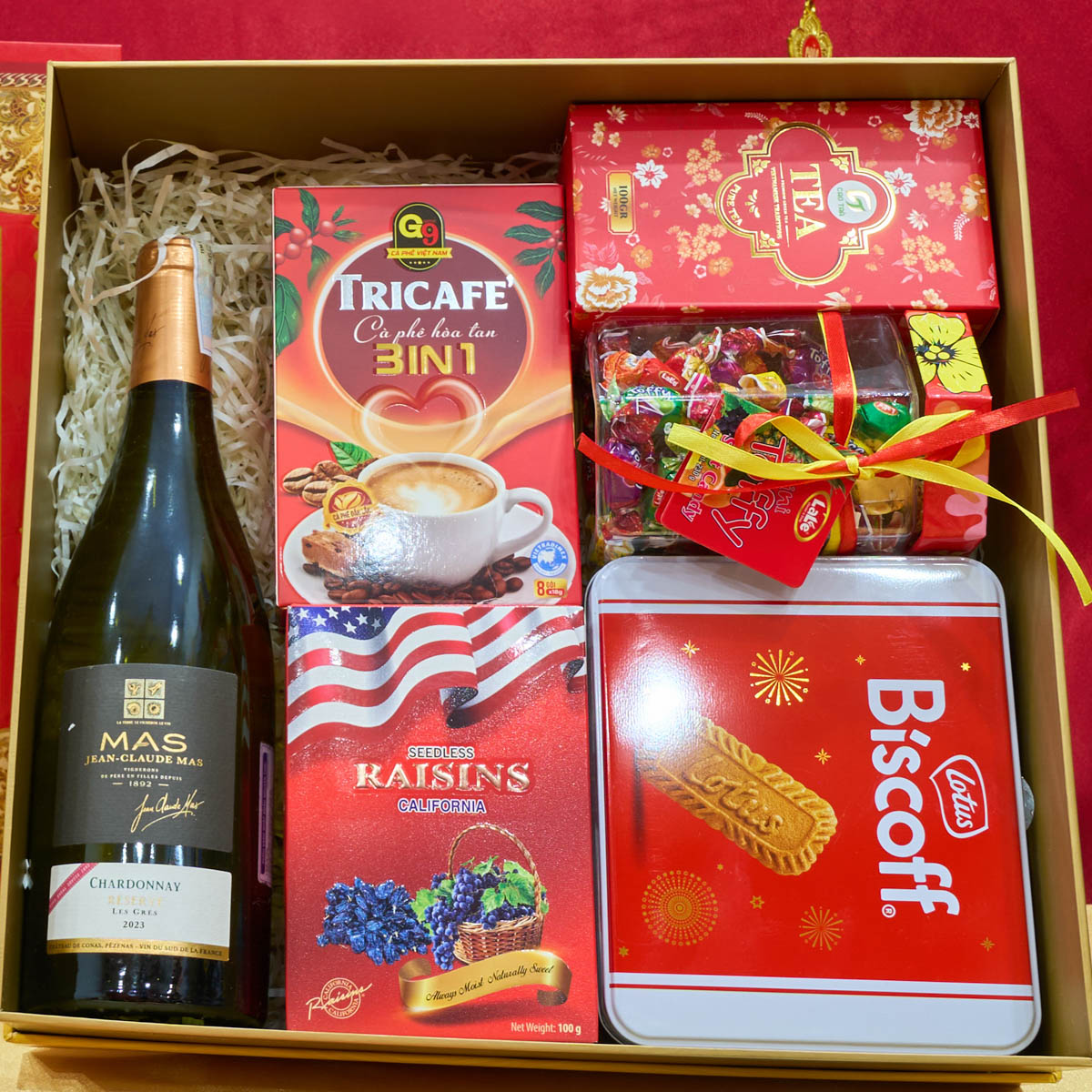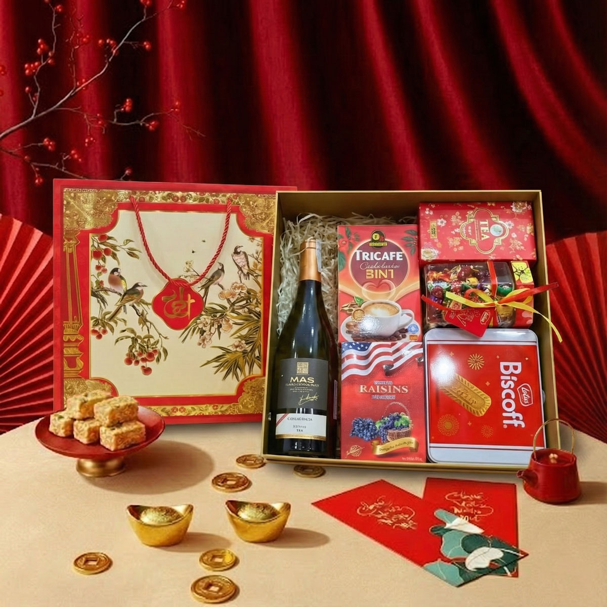 Hộp Quà Tết Tài Lộc HQT2641 là mẫu hộp quà Tết 2026 mang sắc đỏ truyền thống, được thiết kế chỉn chu và nổi bật. Set quà được phối hợp hài hòa giữa rượu vang nhập khẩu cùng bánh kẹo, trà và cà phê chọn lọc, phù hợp biếu tặng gia đình, khách hàng và đối tác trong dịp đầu năm.