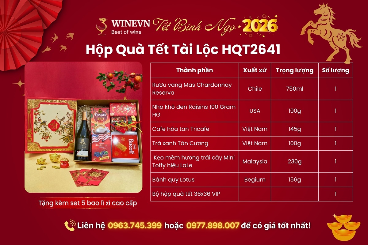 WineVN cung cấp Hộp Quà Tết Tài Lộc HQT2641 với quy trình chọn lọc sản phẩm rõ nguồn gốc, đóng gói chỉn chu và hình thức trình bày trang trọng. Khách hàng được tư vấn set quà phù hợp ngân sách và đối tượng nhận, đảm bảo mỗi hộp quà đều giữ trọn ý nghĩa chúc tài lộc và sự khởi sắc trong dịp đầu năm.