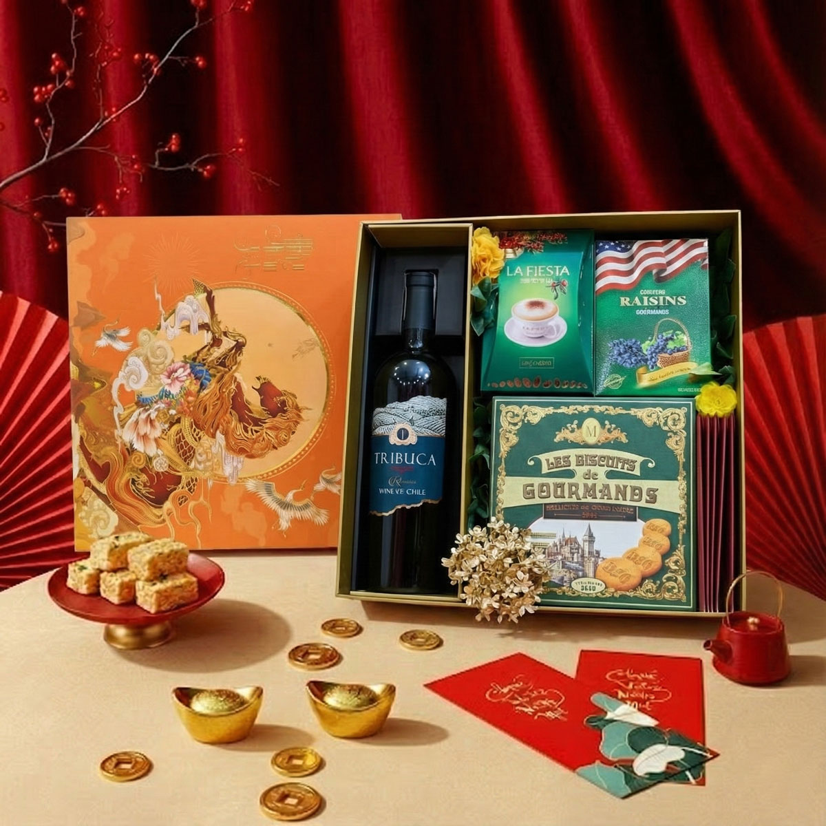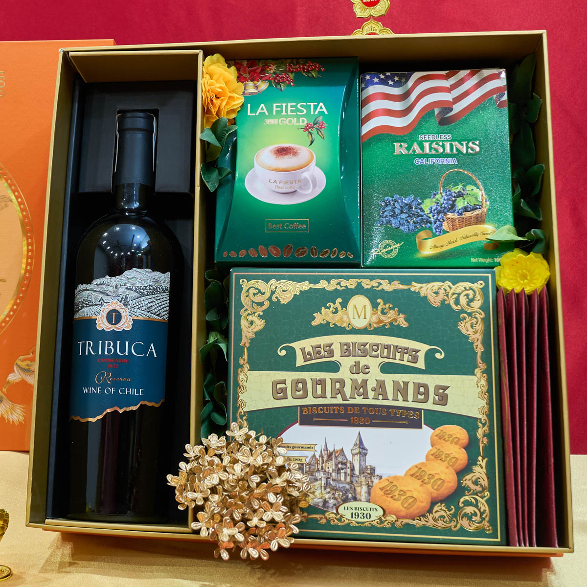 Hộp Quà Tết Xuân An HQT2631 thuộc nhóm quà Tết màu xanh, mang ý nghĩa an lành, hài hòa và khởi đầu nhẹ nhàng trong năm mới. Sự kết hợp giữa rượu vang Chile Tribuca Reserva cùng bánh kẹo, cà phê và trái cây khô quen thuộc tạo nên set quà cân đối, phù hợp biếu tặng gia đình lẫn môi trường doanh nghiệp trong dịp Tết Bính Ngọ 2026.