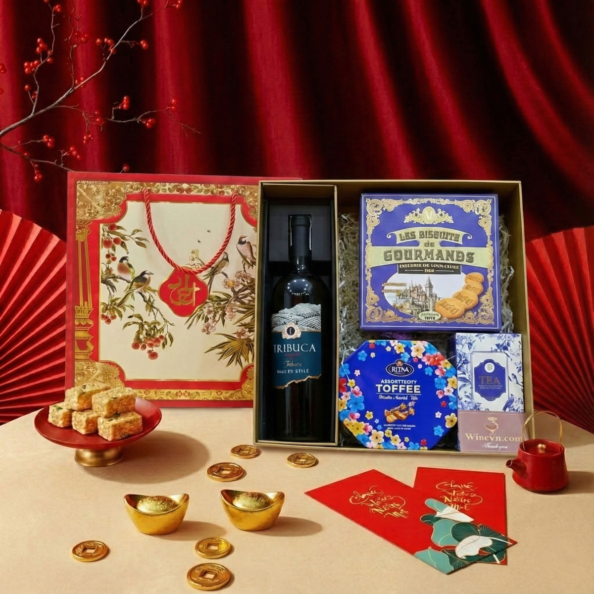 Hộp Quà Tết Xuân An HQT2634 thuộc nhóm quà Tết màu xanh, mang tinh thần an lành, hài hòa và cân bằng trong biếu tặng hiện đại. Gam xanh thanh nhã kết hợp hộp cứng VIP 36 x 36 cm cùng rượu vang Tribuca Reserva, bánh quy, trà xanh Tân Cương và kẹo nhập khẩu tạo nên set quà gọn gàng, dễ trao tặng cho gia đình và đối tác.