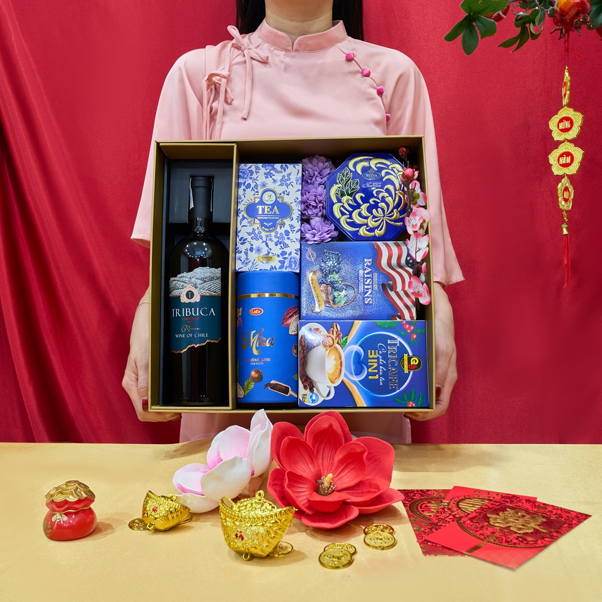 Hộp Quà Tết Xuân An HQT2638 là mẫu hộp quà Tết 2026 mang sắc xanh dịu nhẹ, gợi cảm giác an lành và khởi đầu cân bằng trong năm mới. Set quà được phối hợp hài hòa giữa rượu vang nhập khẩu từ Chile cùng các sản phẩm bánh kẹo, trà và cà phê chọn lọc, phù hợp biếu tặng gia đình, khách hàng và đối tác trong những ngày đầu xuân.