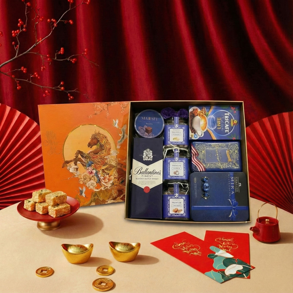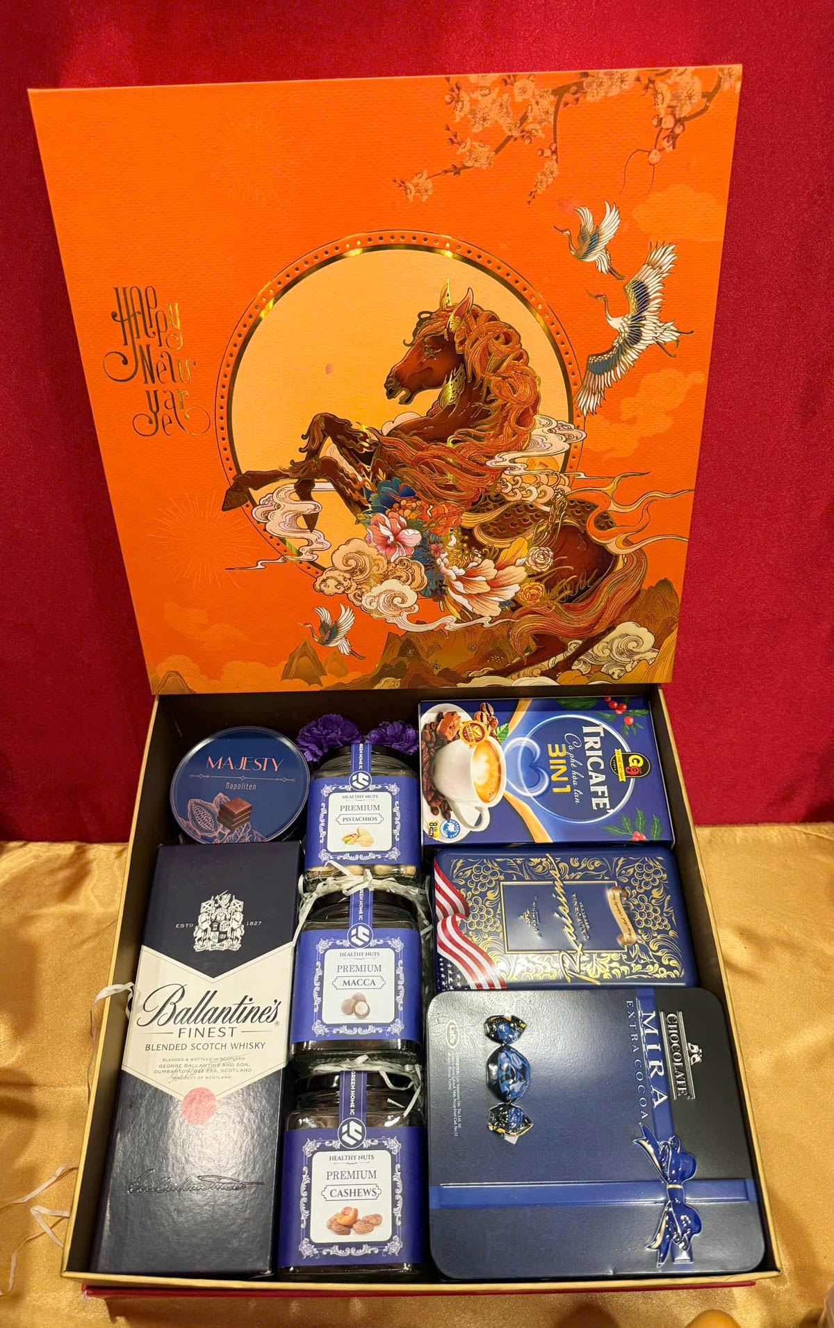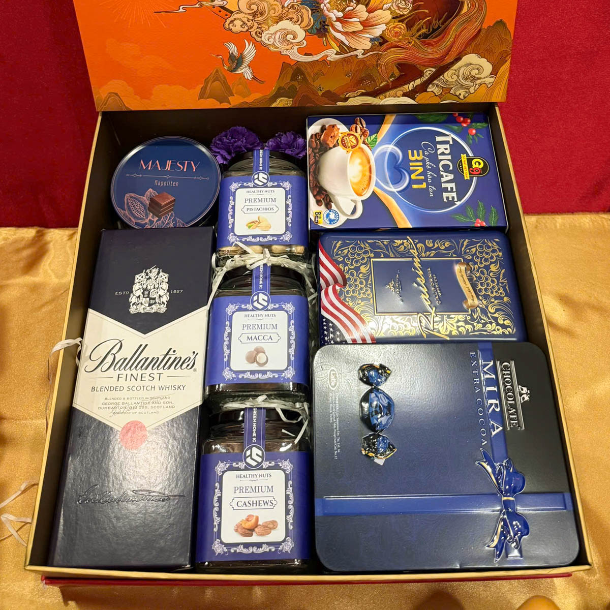 HQT2662 là mẫu hộp quà Tết đẹp được WineVN tuyển chọn dành cho những dịp biếu tặng trang trọng như doanh nghiệp, đối tác, khách hàng hoặc người thân lớn tuổi. Thiết kế hộp tông xanh sang trọng, kết hợp hài hòa giữa rượu Whisky, socola cao cấp và các loại hạt dinh dưỡng nhập khẩu, tạo nên tổng thể chỉn chu, lịch sự và giàu giá trị sử dụng trong dịp đầu năm.