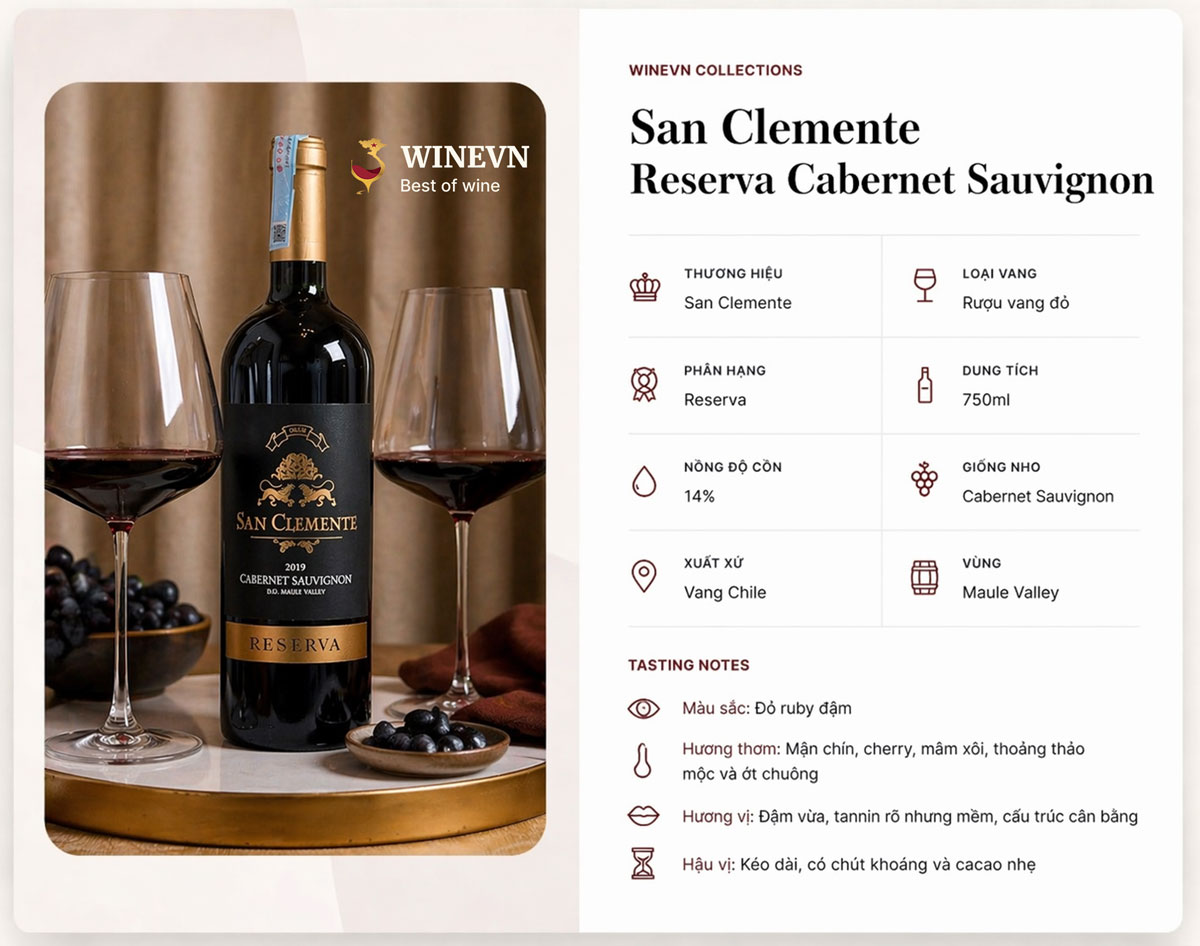 | Tên sản phẩm | Rượu Vang San Clemente Reserva Cabernet Sauvignon |