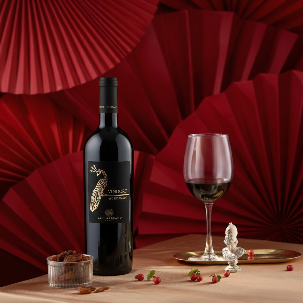 Rượu Vang Con Công Vindoro Negroamaro là dòng vang đỏ cao cấp 15 độ từ nho Negroamaro vùng Puglia, Ý, do nhà San Marzano sản xuất. Rượu có màu đỏ ruby ánh tím, hương thơm trái cây chín, vani, socola, gia vị cay nhẹ, vị tròn đầy, tannin mềm mại, hậu vị kéo dài, lý tưởng cho thịt đỏ, phô mai lâu năm.